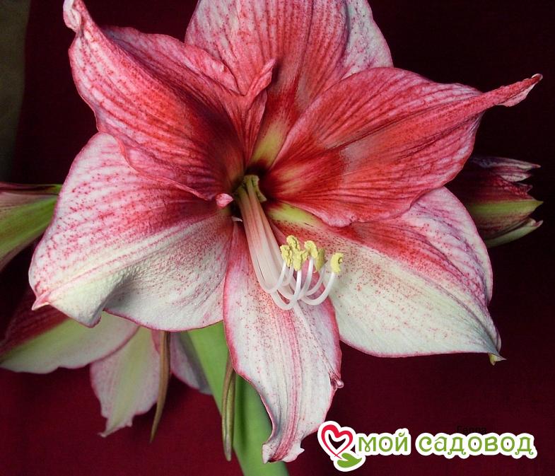 Амариллис Тоска (Tosca) — Цветок сочетает в себе три оттенка, что бывает очень редко. Это красновато-фиолетовый и белый. Расцветка просто очаровывает. Амариллис — это луковичное многолетнее растение. Цветки размером до 16 см. Цветок без запаха. Листья глянцевые, ремневидные, темно-зеленого цвета. Луковица мясистая, округлая, чуть вытянутая. Имеет размер до 10 см в диаметре. Она производит один-два цветоноса, на котором распускается по 3-4 цветка. Высота растения –50-70 см. Цветение: круглый год. Высадка луковицы На дно горшка укладываем дренаж из керамзита или мелких камешков. Слой в 2 – 2,5 см. Сверху насыпаем землю, по центру ставим луковицу и засыпаем ее по бокам, оставляя верхнюю треть луковицы без земли. Поливаем отстоянной водой комнатной температуры. После посадки луковицы, примерно через месяц должно наступать цветение, которое будет продолжаться в течение 2-х или 3-х недель. Место Амариллис очень любит светлые открытые места. Идеально подойдут южные и юго-восточные окна. На лето можно высаживать в открытый грунт с южной стороны, в защищенном от ветров месте. Не любит сквозняков, особенно в зимнее время. Температура Во время бурного цветения, ему будет комфортно при температуре в +23 – 25 °C. В ночное время, допустимо снижение температуры до +18 – 20 °C. Чтобы продлить срок цветения, можно понизить температуру окружающей среды примерно до 18 °C и  убрать излишнее освещение.